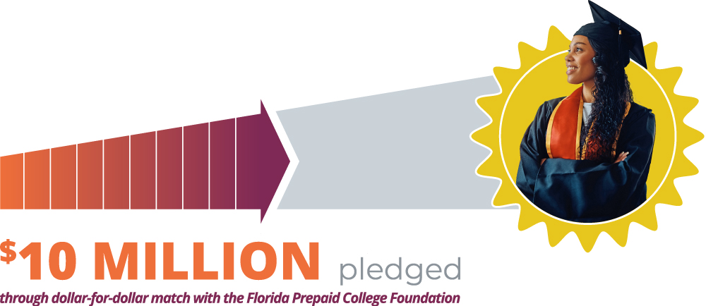 With matching funds of $10 million from the Florida Prepaid College Foundation, together we can make an impact of up to $20 million to help more than 5,000 Florida students achieve their potential and rise out of poverty.